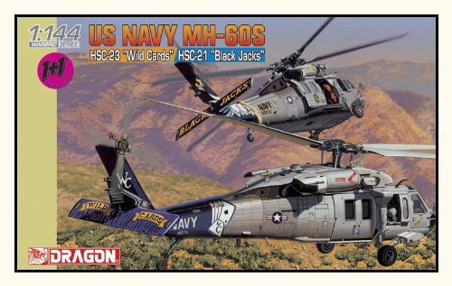 This Dragon 1/144 scale assembly model kit features two Sikorsky SH-60/MH-60 Seahawk helicopters: First a MH-60 operated by the Helicopter Sea Combat Squadron Two One (HSC-21), also known as the "Blackjacks" and second, a MH-60S Knighthawk operated by the Helicopter Sea Combat Squadron Two Three (HSC-23), also known as the "Wildcards". Included in the kit are parts for two complete models. Main features of this model kit include: New radar of glass cockpit representing MH-60S Knighthawk. Authentic details on fuselage. Rescue hoist rendered with detail. Automatic rotor-blade folding system realistically portrayed. New rapid-folding tail pylon.